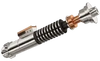 At the heart of the lightsaber is a kyber crystal, which Ezra received in the Jedi Temple on Lothal. In addition to the crystal, the lightsaber was built out of a number of parts from different members of the Rebel crew of the Ghost. Kanan Jarrus had spare lightsaber parts that he had found over the years, Sabine Wren donated modulation circuits and an energy gate, Chopper donated a power cell and Hera Syndulla provided additional technology based on Ezra's specifications. Those specifications included a blade emitter shroud, handgrip ridges, a blade length adjuster, an activator, and a blaster barrel. This weapon was destroyed by Darth Vader in Ezra's second duel against the Sith Lord. | |