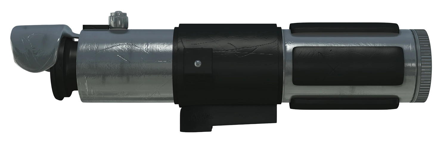 Incorporating many of the elements from his first weapon, Anakin's lightsaber was specifically designed to facilitate his practice of Form V combat. The lightsaber had a solid casing and a heavily shrouded blade emitter. The beveled emitter was designed to designate separate facets of the blade for either offensive or defensive purposes. The lightsaber hilt included a ridged hand grip, as Shien/Djem So required its users to maintain a solid grip on the hilt. It had been his own weapon throughout the Clone Wars, until the end when he turned to the dark side and became Darth Vader. After his defeat on Mustafar, it was taken by Obi-Wan Kenobi for safekeeping, and later passed on to his son, Luke Skywalker. Luke would go on to use his father's lightsaber for three years while being part of the Rebellion. Luke lost the lightsaber, along side his right hand, in his second duel against Darth Vader at Cloud City on Bespin. Though this weapon was believed to be lost forever, it somehow ended up in the possession of Maz Kanata, who kept it for years. It was later used by Finn and Rey in their duel against Kylo Ren, where Rey claimed its possession. The lightsaber was later presented to Luke on Ahch-To by Rey, as a sign that the galaxy needed him once again, but after she handed it to him, he tossed it aside, wanting nothing to do with the weapon or the Jedi. Rey used the weapon during her Jedi training with Luke. Later, it was used by Kylo Ren to kill his own master on the Supremacy. Right after, Kylo returned it to Rey, and she wielded it against Snoke's Praetorian guards. The weapon was broken in half when Rey and Kylo Ren both tried to Force pull it, and she took both pieces with her. Sometime after the Battle of Crait, Rey was able to heal the broken kyber crystal of the lightsaber using the fundamentals of Force healing described in the sacred Jedi texts, and then she reconstructed the weapon. During the Battle of Exegol, Rey gave the lightsaber to Ben Solo through their bond and he wielded his family heirloom to defeat the Knights of Ren. After Palpatine's death and the end of the war with the First Order, Rey buried it along with Leia's lightsaber in the ruins of the Lars homestead on Tatooine; retiring the weapon, as well as honoring the Skywalker family where their legacy began. | |