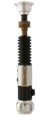The construction of Luke's green lightsaber was based off schematics Luke found in Obi-Wan's hut on Tatooine. Luke was able to gather most of the parts he required to build his weapon from various vendors in the city of Mos Eisley, including a high-energy reflector cup, power cells, and a focusing lens. However, Luke was unable to obtain a lightsaber crystal and was forced to fabricate his own, utilizing a small blast furnace and a book of instructions found within the home of his fallen Master. The resulting hilt greatly resembled that of his late master, Obi-Wan Kenobi. The weapon possessed superior balance to Anakin Skywalker's lightsaber. Possibly as a result of utilizing a thick kyber crystal, the lightsaber made a distinctive snap-hiss sound when activated, which was a different sound to that emitted by his father's weapon. Luke was still in possession of the lightsaber during the time he started to train a new generation of Jedi. He wielded the lightsaber against the Knights of Ren on Elphrona. Luke was holding this lightsaber when he was briefly tempted to kill his own nephew, Ben Solo, after sensing the darkness inside him, which resulted in Ben waking up and trying to defend himself with his own lightsaber. After Ben fell to the dark side and Luke's Jedi Temple was destroyed, Luke took his lightsaber, as well as Leia's, with him to exile on Ahch-To, where he would never lay hands on it again for the rest of his life. After his death, it, along with all his other personal belongings remained in possession of the Caretakers on Ahch-To, but his spirit gave Leia's to Rey. | |