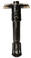 Ben Solo constructed his lightsaber during his training with his uncle Luke Skywalker. It had a blue plasma blade, and a hilt with squared-off corners and geometric lines like his mother's saber. The hilt also had finned grips similar to his grandfather's Sith lightsaber. Ben used this weapon while he was a Jedi apprentice in his uncle's academy. One night, when Ben was asleep in his hut, Luke had sensed his power being brought to the dark side by Snoke and activated his own lightsaber, attempting to kill his nephew. This caused Ben to wake up, force-grab his lightsaber, and activate it to prevent his uncle from doing so, before collapsing the hut. Ben kept the weapon and modified it into his cross-guard lightsaber after turning to the dark side. His corrupted lightsaber, made from his old Jedi weapon, had a main red blade, and two smaller red blades that projected from the side of the weapon as a crossguard. The reason for the blade's unorthodox appearance came from the fact that the kyber crystal powering it was cracked and damaged during its master's use of the dark side of the Force to bleed the crystal. As a result of the cracked crystal, the lightsaber blade became ragged and unstable, with the blade funneling like fire and static electricity instead of solidifying. It could barely contain the weapon's power, so it necessitated the use of vents and focusing crystal activators to funnel away the weapon's excess energy, creating the signature quillons (crossguards). The emitter shrouds for the quillons were a necessity to protect Ren's hands from his own weapon. The damaged crystal also gave the lightsaber a deep, growling hum that further made it unique and terrifying to behold. The lightsaber's hilt was based off an ancient design dating back thousands of years to the Scourge of Malachor, but unlike those, Ren's lightsaber was crudely built and slipshod in its design, but this was due to Kylo Ren's desire to made it easily reparable and menacing-looking. Kylo utilized this weapon at the time he served Supreme Leader Snoke and the First Order. He used it to murder his father, Han Solo and during his duel with Finn and Rey on Starkiller Base. Later, he used it while fighting beside Rey against the Praetorian guards and to confront his uncle on Crait. He continued to wield the weapon while he was searching for Rey after he became the Supreme Leader of the First Order and used this saber during his last duel against her atop the remains of the second Death Star. In the aftermath of the duel, after being saved by Rey from his mortal injures and conversing with a vision of his father, he threw his lightsaber away in the ocean, reclaimed his identity of Ben Solo, and turned back to the light side. | |
