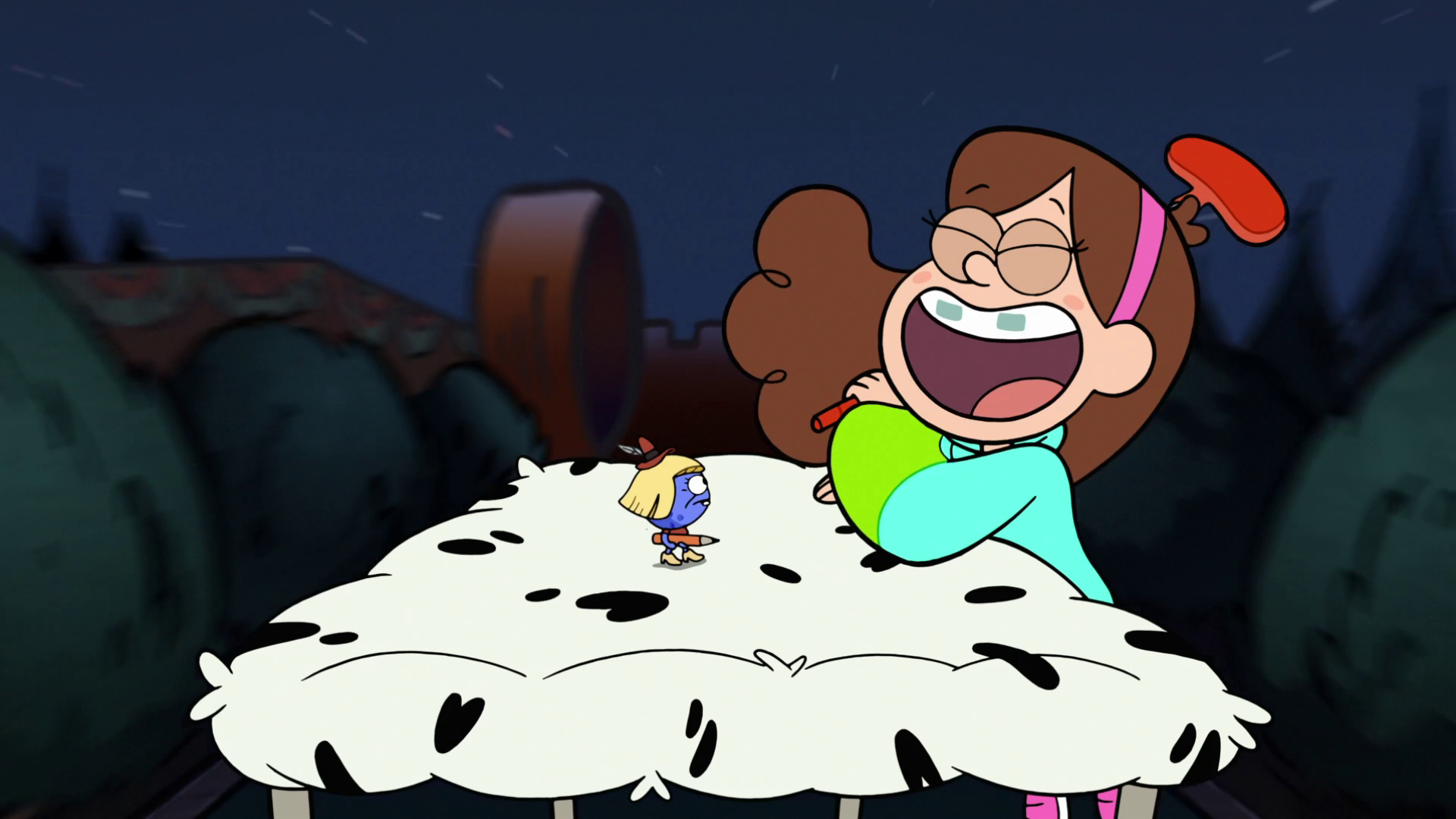 In "Blendin's Game", after finding out that it was Soos' birthday, she, Dipper, Candy and Grenda throw him a surprise birthday party. However, they don't get the reaction they were hoping for and Soos goes away depressed. Wendy then tells them how Soos dislikes his birthday though she doesn't know why. So instead of trying to bring up anything to do with a birthday, they bring Soos to his favorite place, Big Gunz Laser Tag. While running to the laser tag arena, they suddenly slip into a completely white room through a portal. They then meet Lolph and Dundgren of the Time Paradox Avoidance Enforcement Squadron. Surprisingly enough Blendin appears before the twins too, stating that he challenges them to Globnar, where he hopes to win the time wish to rid of their existence. Mabel uses a distraction idea giving Dipper the chance to steal the time measuring tape and the two accidentally go ten years back to the past with the time measuring tape breaking. While trying to avoid the enemies tracking them, they head to the Mystery Shack where they meet 12-year-old Soos. Following him to his party, they find out why Soos dislikes his birthday so much. They willingly let themselves be caught in order to win the time wish and give Soos his deepest desire. After many challenges in the game, she and Dipper come out on top and letting Blendin go free because they felt guilty for getting him in trouble. Going back to the present, they tell Soos about where they've been and gives him the time wish. Ultimately, Soos doesn't use the wish for his father and gets over him, using the wish for better matters, and embracing Dipper and her as true family.