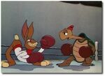 The Hare later returns for a boxing match, alongside his rival, Toby. After Max Hare dodges Toby's punches he turns to the bunny girls, who begin to giggle. When Toby tries to sneak up on Max, they warn him, but he already knows and punches Toby. In the second round, Toby uses his shell to protect himself from Max’s punches. The Hare tries to grab the turtle but gets his hand trapped by a mouse trap. After that, Max tries to fill his shell with water, but Toby spits all the water at him, making him angry. Then, Max puts a lot of fireworks inside his shell and lights them up, making Toby fly around and hit him several times. One of the fireworks takes Max away and he ends up being taken away to the hospital.