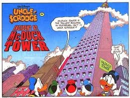McDuck Tower is the tallest tower in Duckburg. It is located downtown somewhere near the statue of Cornelius Coot. The building consists mostly of offices and apartments with residences. On top of the tower, there is a large clock with the words "McD" spelled on the back, referring to "McDuck". It was built by Scrooge McDuck, originally to be three stories tall but then greatly extended due to the price of the building materials. Most of it is unknown due to it.