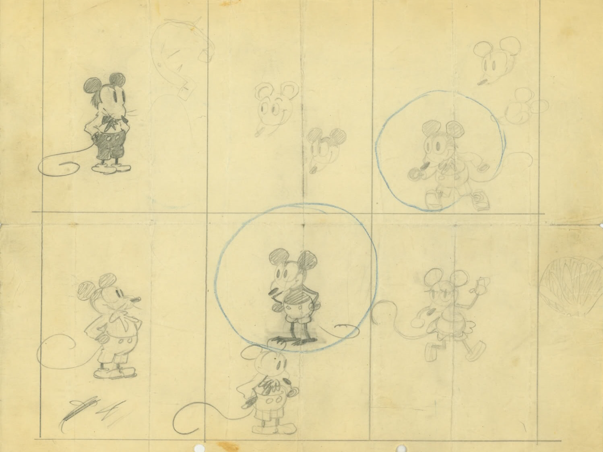 Concept art of Mickey from early 1928; the sketches are the earliest known drawings of the character, from the collection of The Walt Disney Family Museum.