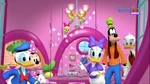 The gang all head for the tree swing, except for Pluto, who continues to take his nap. Meanwhile, Minnie finds the swing broken (one of the ropes has come loose) as a baby bear observes her basket of products. The others find Minnie, prompting the baby bear to hide. Noticing the broken swing, they call Toodles for the springy shoes, which Goofy uses to tie the loose rope back on the tree branch. After Minnie enjoys the swing, the others show her the big surprise, but must first say the magic words: Meeska, Mooska, Minnie Mouse. This causes a brand new clubhouse that resembles Minnie's shoe to appear, which is given to Minnie as her own personal clubhouse. Inside, Von Drake shows her a lever on the stairs that can control the clubhouse's machinery. The clubhouse has a kitchen, a sewing area, a pet care, and a stage. Cuckoo-Loca and her clock are also in the clubhouse as well. The baby bear from earlier sneaks inside and eats some of the finished muffins. The gang discover that two muffins are missing and only six remain, and there are seven of them. The baby bear lands on the stair lever, causing the machinery to go haywire. As the professor fixes it, Cuckoo-Loca briefly catches sight of the bear. The rest of the gang find him on a tea table. The baby bear quickly runs out of the clubhouse and hides behind the trees. Unable to find him, the professor attempts to use his Blimpy Blazer to locate the baby bear, but it springs a leak and sends him flying away, so the gang call for Toodles. Goofy suggests the chart of animal paw prints, but Mickey shoots this idea down as there are no paw prints in the area. They instead use the Mystery Mousekepal, who is revealed to be Super Tracker Pluto. He helps track the baby bear back to Mickey's clubhouse, where he rides the cup car to the Fanfara. Mickey and Minnie use the cup car to follow him up there, but the frightened bear hides behind a drum. They call Toodles for the blanket to calm him down, and the baby bear feels much better under the blanket. They bring the baby bear down and Cuckoo-Loca arrives with the other muffins to give the baby bear. Mickey and Minnie take the baby bear home while the others stay behind. They come across three road, each with a trail of paw prints. They call Toodles for the chart of animal paw prints. The paw print on the left side of the chart is what there are looking for and since the road going right has those paw prints, the three head down that road and find a cave where the mother bear lives. The baby bear reunites with his mother and Minnie leaves the muffins for them.