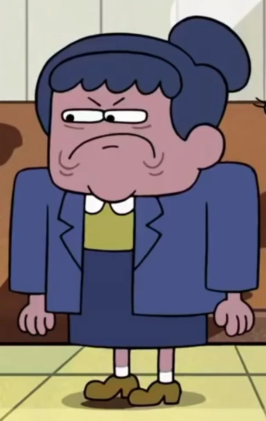 Ms. Cho is a short and squat old woman with reddish purple skin. She has thin eyes with tiny angry eyebrows and her mouth is constantly in a down turned grimace that seems permanent (though in "Cricket's Kapowie", she did briefly smile). She big shoulders made possible from the navy blue coat she wears. Underneath is a yellow blouse and a blue skirt, matched with light brown shoes. She has dark blue hair with a bun ponytail in the back and noticeable bangs.
