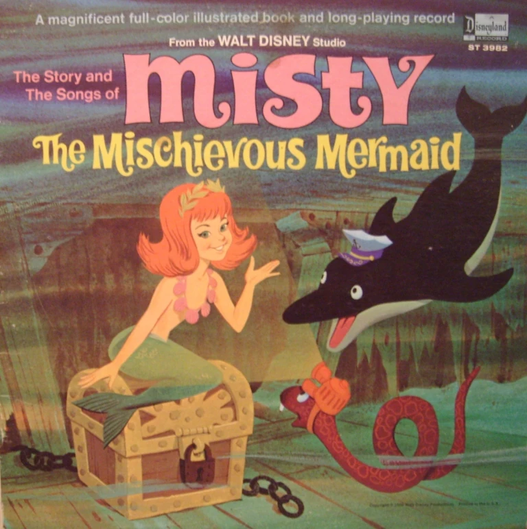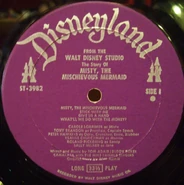 Misty the Mischievous Mermaid is a 1969 Disneyland Records storyteller LP that invites speculation about its source material. Hans Christian Andersen's The Little Mermaid was one of the last stories that Walt Disney considered as a feature film, so it is conceivable that a good amount of concept may have been done between that and the film's eventual release in 1989. Some of this early material may well have made its way onto the Misty LP. The story, recorded with a British cast, concerns itself more with pirates and treasure than the Andersen tale, but Misty has her share of undersea friends and even has the same red hair as Disney's Ariel (though Misty wears it in a 1960s-style hairdo).