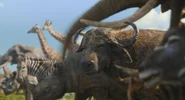 Mobo is a large and well-built cape buffalo. He has dark brown fur, two curved gray horns, and brown eyes.