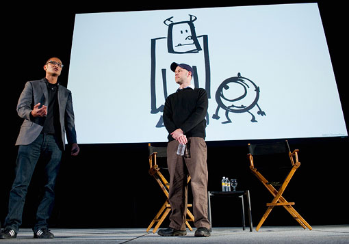 Dan Scanlon and production designer Ricky Nierva show a concept sketch of Sulley and Mike at the D23 Expo.