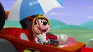 Billy Beagle announces a race with four challenges; the first to pass all 4 and cross the finish line will be the winner. Mickey takes an early lead, but SRR surges forward after swerving past the pylons popping up and easily traversing a spiraling tower as Mickey gets dizzy. The third challenge is water balloons, and Mickey protects himself with an umbrella. However, the water causes SRR to short circuit and drive into town to complete von Drake's tasks: pick up lunch, pick up his laundry, and take von Drake to the movies. Mickey tells the others to get in their Roadsters and follow the AI.