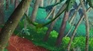 The jungle appears regularly in the series. In the episode Hats Off to Hook!Jake and his crew discover Captain Hook's hat washed upon the shore of Pirate Island and try to return it to him. Meanwhile, Hook and his crew are also searching for Hook's missing hat on the Jolly Roger, Hook accidentally lands on a catapult launching into a palm tree in the Never Land Jungle. Sharky and Bones get Hook down were he spot Jake and his crew with his hat believing they stole. The Jungle lends to new locations such Sailor's Swamp and Tiki Forest.