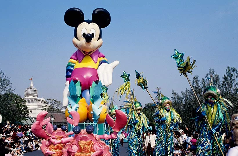 The Aquatic Unit is the largest out of all the units in the parade. It starts off with various performers in giant shell and fish costumes and then is followed by a band, and then a hand-pulled crab float. Mickey's character float follows, hosted by Mickey and many performers. This is then followed by the huge Mickey Mouse balloon, (which is, in fact, the same and original design that was going to be used in the American version but was scrapped in favor of Sorcerer Mickey) wearing a colorful collared shirt and sitting on a drum, with the float full of penguins from Mary Poppins. Flounder and Sebastian follow the Mermaid float, featuring an assortment of mermaids, with Ariel sitting in the giant clam. Following on is a character float with just performers on, due to it still being themed as an underwater carnival.