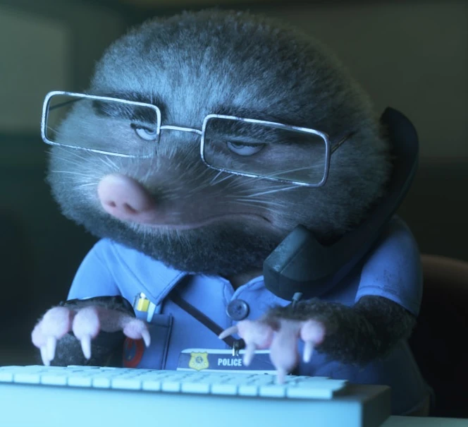 Later on, Paul is on call with a citizen suffering technical problems. Clawhauser, seeking to use his computer to track Captain Hoggbottom on behalf of Nick, attempted to offer him a box of doughnuts, only to accidentally trip and get Paul stuck in a donut hole in the box, which was then taken by a passing officer, forcing Clawhauser to login to Paul's workstation with its rodent-sized computer hardware.