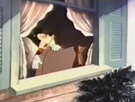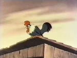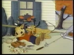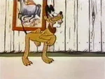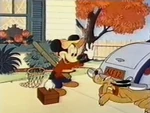 Later, Pluto tends to some farm chores around the property including feeding the chickens. But when he notices his own dish empty, he resorts to stealing a bone from Butch the Bulldog, who lives next door. In the meantime, one of the chickens has built a nest in his doghouse and lays its eggs, but when the hen leaves, distracted by a butterfly, Pluto ends up playing mother to its chicks after they hatch under him.