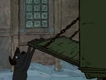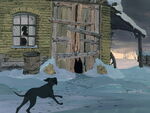 Roger, Anita, Nanny, and Pongo are startled at the sudden appearance of Cruella De Vil.