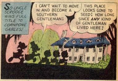 In his first (mentioned) appearance in 1955, Scrooge McDuck and a certain Horseshoe Hogg bring their uncles' steamboats (one of which is Pothole's Cotton Queen) back to the surface to finish the race for the Cornpone Gables mansion, which was claimed by both Horseshoe's uncle Porker Hogg and Scrooge's uncle Pothole McDuck. Scrooge wins, only to learn that 85 years of disuse made the mansion so fragile that he accidentally destroys it with a sneeze.
