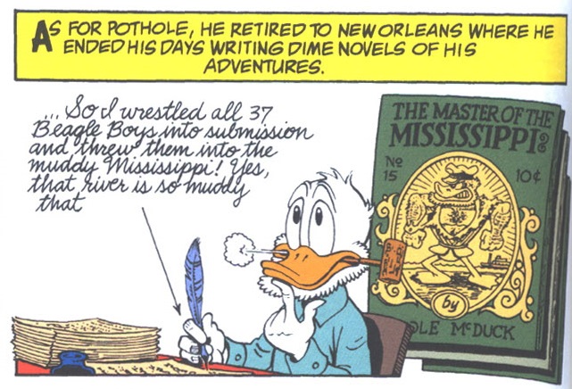 As shown near the end of that same story, Pothole eventually decides to retire. He leaves his riverboat to his nephew and settles down in New Orleans, where he becomes the writer of a popular series of dime novels under the title The Master of Mississippi, based on a highly exaggerated description of his life.