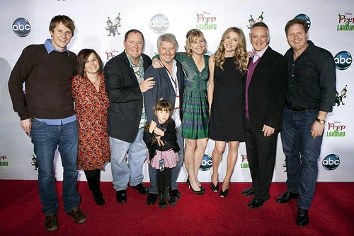The cast and crew of Prep & Landing at the premiere in November 2009 at the El Capitan Theatre in Los Angeles. From left: Derek Richardson (Lanny), Dorothy McKim (producer), John Lasseter (executive producer), Dave Foley (Wayne) with his daughter Alania, Stevie Wermers-Skelton (writer/director/Rev-Up elf), Sarah Chalke (Magee), Kevin Deters (writer/director/Brian), and Stephen McPearson.