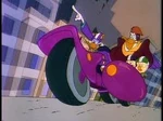 In the original opening scene to "Darkly Dawns the Duck" (cut from reruns and the DVD release), Darkwing is shown riding the Ratcatcher off a makeshift ramp, into the back of a criminal's pickup truck, catapulting the drivers out the truck's windows into a trash can.