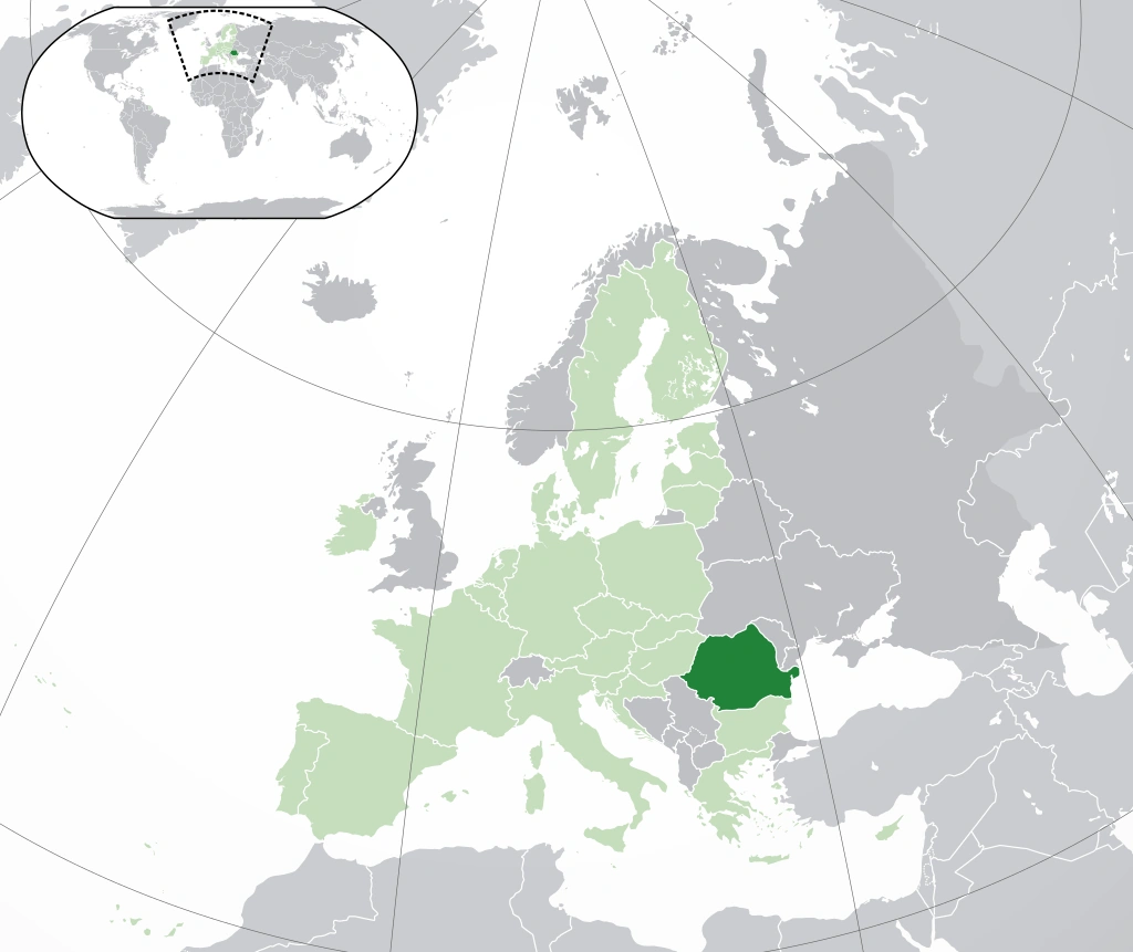 Romania is a sovereign state located in Southeastern Europe . It borders the Black Sea, Bulgaria, Ukraine, Hungary , Serbia , and Moldova. It has an area of 238,397 square kilometers (92,046 sq mi) and a temperate-continental climate. With almost 20 million inhabitants, the country is the sixth most populous member state of the European Union. Its capital and largest city, Bucharest, is the sixth-largest city in the EU, with 1,883,425 inhabitants as of 2011 .