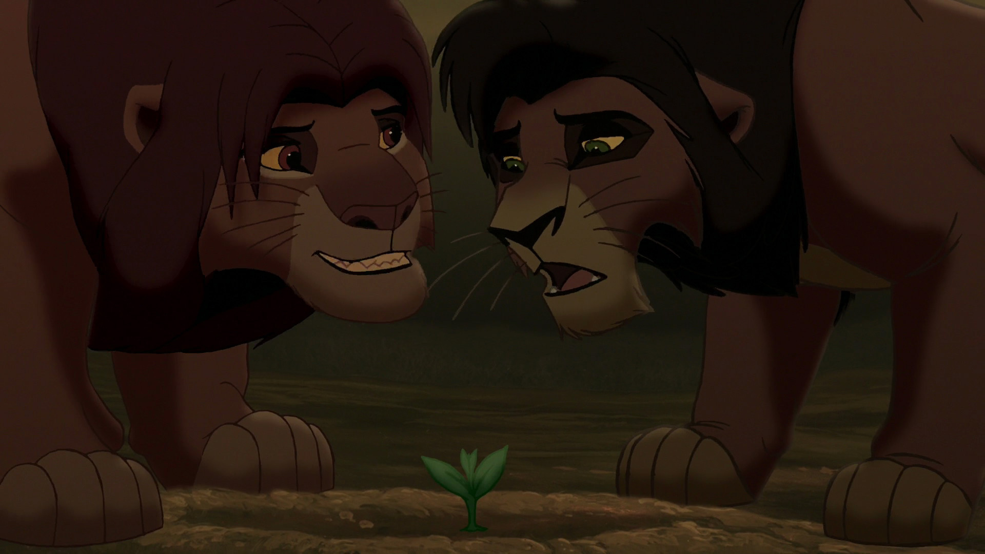 Kiara ends up crossing over into the Outlands, where she meets Kovu, an Outsider cub whose pride was exiled by Simba due to their loyalty to Scar. The two befriend each other until Simba leaps in to confront Zira, Kovu's mother and Scar's most loyal follower, who was watching the two cubs. Zira tries to goad him into killing Kovu, since the king threatened a penalty to any Outsider who trespasses on the Pride Lands, but Simba, disgusted that Zira would offer her son like this, spares him (also knowing that he can't call her bluff since she knows that he wouldn't hurt a cub). After the confrontation, Simba, disciplining her like his father had with him, scolds Kiara for endangering herself and explains to her that they "are one."