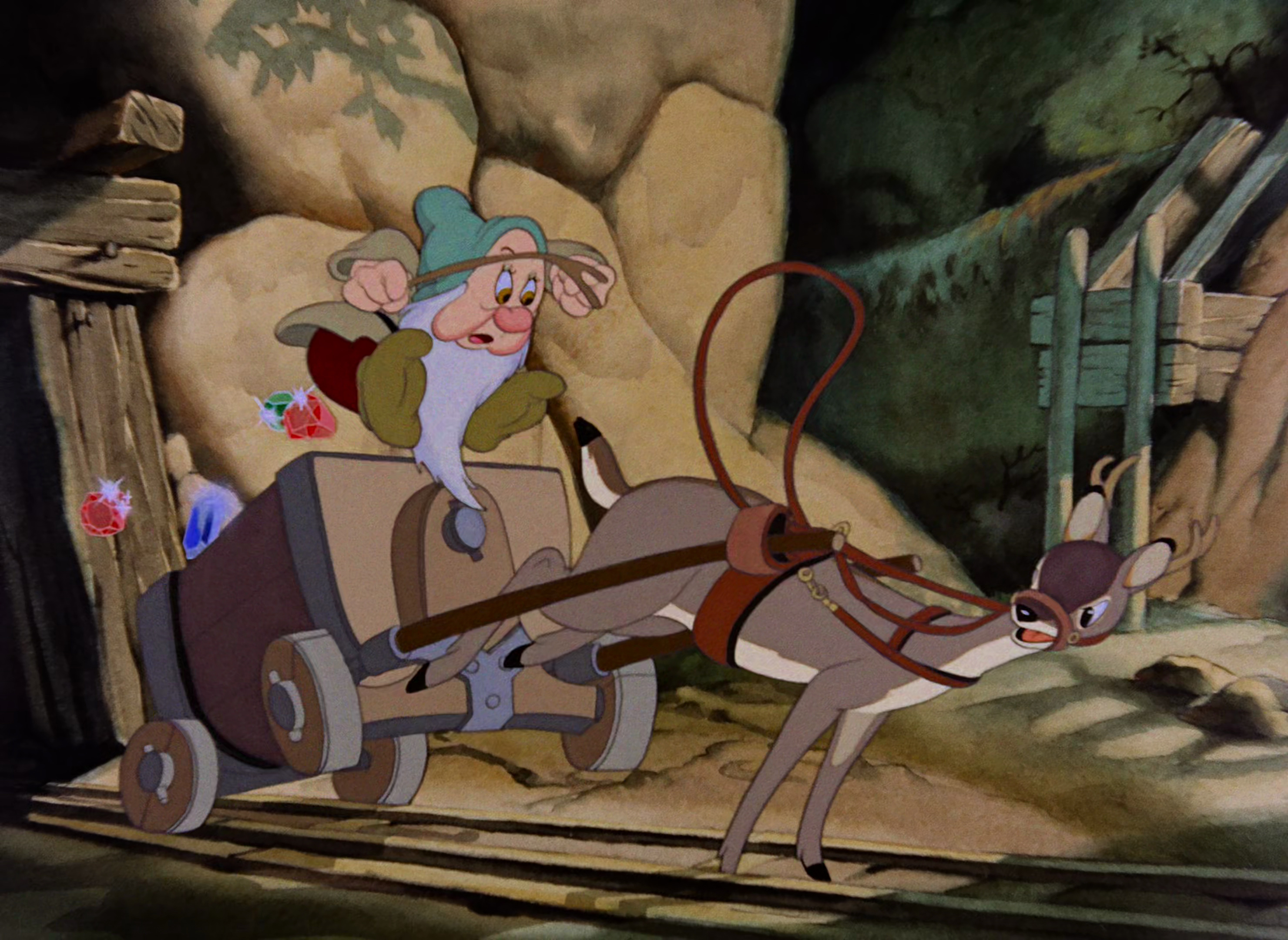 Sleepy is first introduced, with all the other dwarfs, at the Dwarfs' Mine. He controls the mine cart, transporting the diamonds mined, to their leader Doc, who then sorts them. The cart is pulled by a deer. At one point the fly pesters Sleepy, who, in an attempt to swat it, he accidentally hits the deer's backside; this causes the deer to kick the cart several times, sending Sleepy flying. As the dwarfs' march home, singing "Heigh-Ho", Sleepy is fourth in line, behind Happy and in front of Bashful. He is the only other dwarf beside Dopey not to join in the singing, as he is too tired.