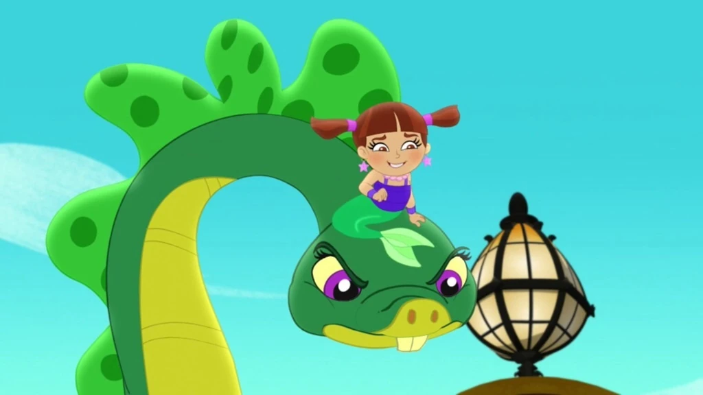 While Jake and his crew were exploring the wonders of the Never Sea with Stormy they reach the Cave of Neptune when they hear Slink's Mother roar mistaken it for Slink on their first meeting. Not wanting to invoke the rage of Slink's mother, they decide to return to Pirate Island unknown to them that the baby sea serpent has followed them back to the island and later gets captured by Sharky and Bones as the main attraction of Captain Hook's petting zoo. Slink's Mother appears later in the episode thanks to Stormy to prevent Hook and his crew from escaping with her baby.
