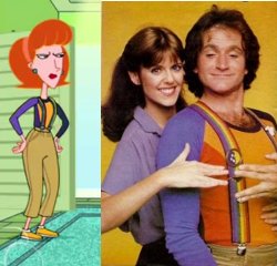 - Linda tries on Mork's (Robin Williams) trademark rainbow-striped suspenders from Mork & Mindy. Along with the suspenders, Mork's outfits often had unmatched sleeve colors and sometimes included khaki pants as does Linda's ensemble.