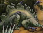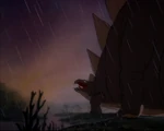 Stegosaurus is one of many fauna in The Rite of Spring segment. It is unusually mixed in alongside species of the Permian, Triassic, Jurassic, and Cretaceous periods. When the Tyrannosaurus rex first makes its appearance, the Stegosaurus is shocked like the many of them. As the T. rex lunges for the herbivores, the Stegosaurus attempts an escape, but is slow in getting away from the dangerous predator and resorts to fighting the T. rex in an effort to save its own life. However, the battle comes to an end with the T. rex emerging victorious. The carnivore then proceeds to eat the fallen herbivore as the scene becomes quiet and fades to black.