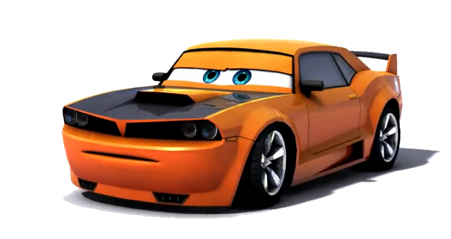 Stinger has an orange livery, and blue eyes, plus his hood is painted black. Being a muscle car, he sports a raised spoiler, and is based on a 2009 Dodge Challenger. His license plate reads his entire name, "STINGER".