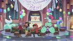 It is Stump Day, the Mewni equivalent to Christmas, and all of Butterfly Castle is glad to celebrate it, especially Star who is ecstatic about the holiday. As revealed by River, Stump Day is the day that the first Mewman settlers came to Mewni. They quickly began to argue and were going to split up, but a terrible storm came and they were forced to look to a giant stump for shelter. Afterwards, they carved their initials into the stump and since then the Mewmans have stayed together and celebrated the stump. Later that night, Marco awakens Star to help with a window, but instead takes her to the living room to reveal that he, along with Tom, Pony Head, Kelly, Janna and StarFan 13 have all set up a Quinceañera for her as it is also her birthday. To their surprise Star becomes upset and proceeds to tell everyone to put up the decorations and continue to celebrate Stump Day.