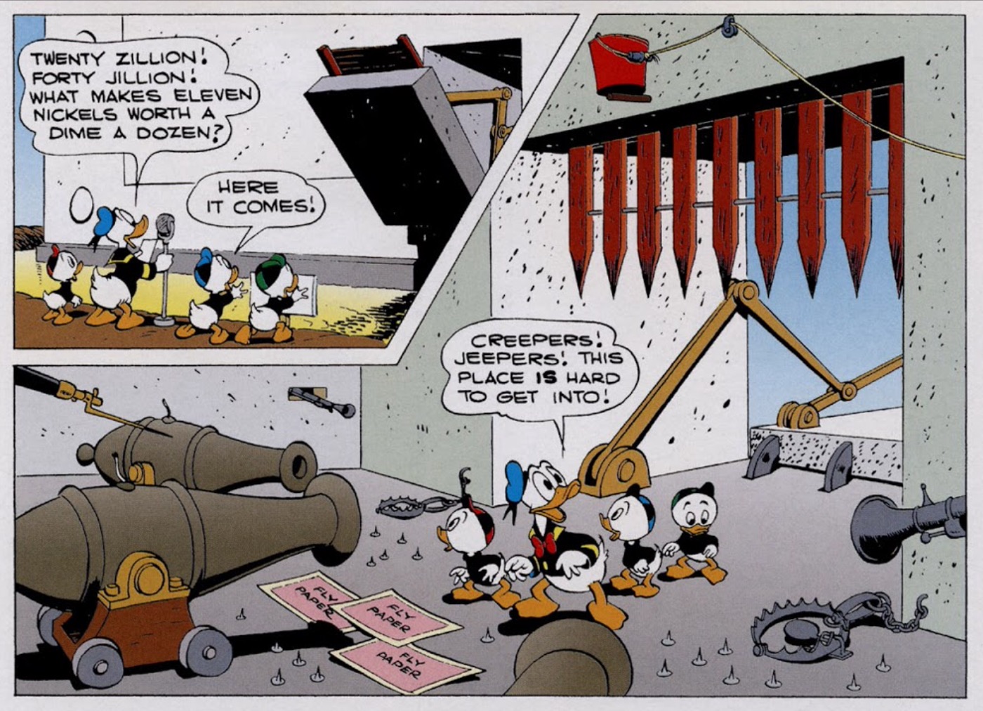 The heavily guarded entrance to Scrooge's money Bin in Carl Barks' The Big Bin on Killmotor Hill.