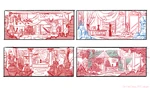 - The Kitchen: Found at the back of the house. A huge window gives a view of the land behind the house, with a door leading outside. The kitchen itself has a table, a refrigerator, a range, and shelves lined with various objects.