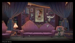 - The Living Room: Located right behind the front door. It includes a fireplace, two couches, candles, a wall of artifacts and Eda's wanted poster, and artwork of an owl creature on the ceiling.