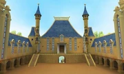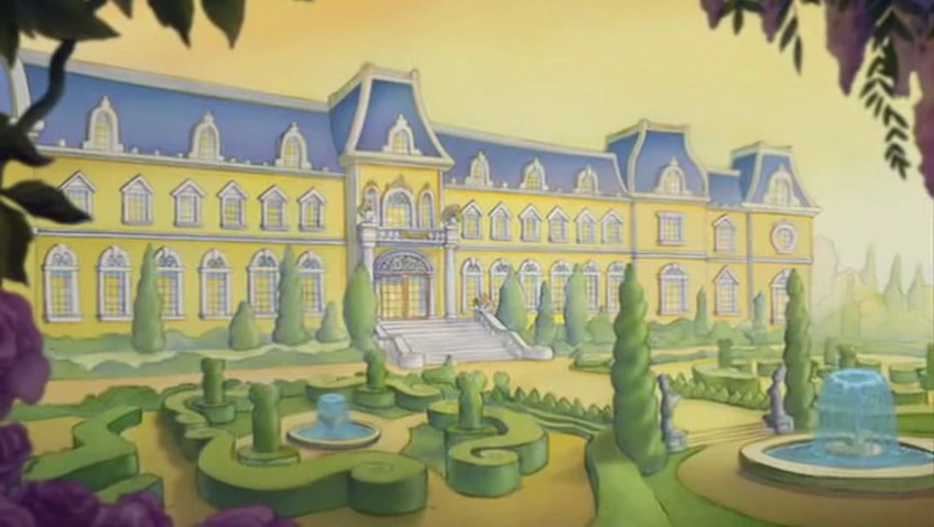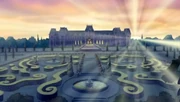 The Palace of Versailles acts as Minnie 's royal home in Mickey, Donald, Goofy: The Three Musketeers . It has many winding corridors two of which lead to The Throne Room and the Bedchambers. The Throne is gigantic for such a minute monarch. Minnie is the reigning princess of France in the film. Surrounding it are a stretch of gardens. At the front is the Entrance Courtyard. It is located across the river.