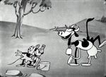 As the title implies Mickey was depicted as a farmer alongside Minnie Mouse. He is first seen with his horse while plowng a field. Then Minnie comes along with her cow. She has Mickey milk the cow for her. As he does, the cow starts licking him in an apparent sign of affection. Mickey does not seem pleased and replies by rolling up its muzzle with its own tongue.