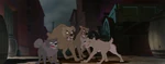 Rufus, Alfred, and Ford’s only appearance in the film is after Lady runs away after being muzzled by Aunt Sarah. She ends up in the trainyard alley where they reside. The three suddenly emerge, begin chasing, and viciously barking at her. However, Tramp notices what is going on and rushes after the dogs. The strays corner Lady in a dead-end alleyway, but Tramp intervenes and manages to distract and fight off all three of them before they could attack Lady.