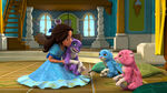 However, after Migs and Elena leave Isabel with the eggs in her care, they completely hatch and a blue, pink, and purple Jaquin are born. Isabel wonders at first if she should get Elena, but ultimately decides to deal with the baby Jaquins herself. After she tells him he inherited his mother's fur, the purple baby Jaquin hops into Isabel's arms and calls her "Mommy". An amused Isabel, who's shocked that the baby Jaquins can already talk, tells the triplets "I'm not your mommy. I'm Isa." The blue and pink ones get the message and call Isabel "Isa" but the purple one calls her "Mommy" again. Isabel teaches the baby Jaquins how to play a game where one claps hands with a playmate while reciting "Tortillitas de manteca Para Mama' que esta' contenta Tortillitas de maiz Para Papa' que esta' feliz". Isabel is now convinced that watching the baby Jaquins will be easy, but they prove to be advanced to the point where they can already fly, too. The three Jaquins quickly get way out of control. Isabel gets upset, especially when they start chewing everything. Noticing this, the purple one goes "Mommy" again and indicates his mouth with his paw. Isabel realizes they are hungry and tells them their parents are looking for some Anoki Berries for them. To Isabel's shock, the blue one opens the door to go look for some food. Isabel goes after him, leaving the door open, and the purple one goes after her. Elsewhere in the palace, the Avalor Bake-Off is about to commence, and Doña Paloma welcomes Lady Yolanda to the competition. The blue baby Jaquin comes in and tries the food, but spits it back out as none of it are Anoki Berries. Isabel appears to stop him, but fails and disrupts Carmen and Julio's attempt to bring their pies to their table. Meanwhile in the kitchen, Armando is still working on the frosting for his entry. He is still not satisfied with it, and Mateo understands how he feels. He has been working on an Enlarging Potion that so far only makes things shrink. Back at the Bake-Off, Isabel is still pursing the blue baby Jaquin, when she discovers the purple one followed her. He eats a cake, only to spit it out as it is not an Anoki Berry. Isabel puts a tray cover over him just as Elena shows up. Elena asks Isabel why she is not watching the eggs. Isabel lies that she got hungry and takes the tray with the purple baby Jaquin on it back to her room, which is now a mess. A frazzled Isabel tells the purple and pink baby Jaquins to stay put while she gets their brother back.