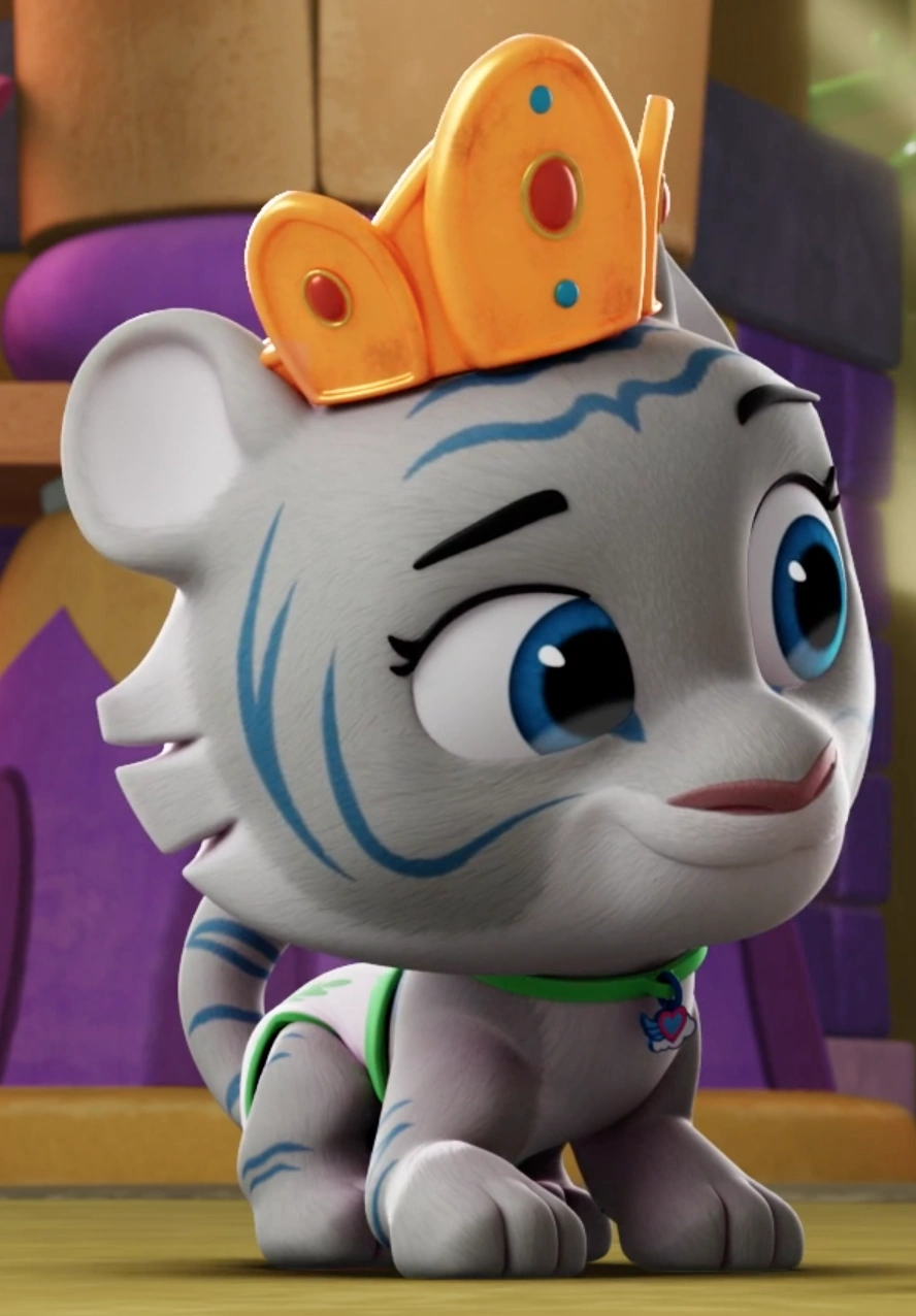 Tiberius is a baby tiger with gray fur and dark blue stripes. He has blue irises and a dark pink nose. He also wears a collar with the T.O.T.S. symbol. He spots a diaper with green trim and leaf symbols on them. As of "Adventures In Tigersitting", he wears a gold crown on his head.