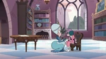 Hiding her under her dress, Moon sneaks Eclipsa into the Bureaucracy of Magic. They find the secret entrance to the archive in a coat closet, and nearly get caught by Sean the security guard until Moon accidentally erases his memory. Through the maze of a dozen passageways, Eclipsa sings a song that helps her remember which way to go. They make it to the royal archive which is behind a huge locked door. Unable to get in, Eclipsa crawls into a rat hole by the door. Moon tries to follow her, but gets stuck. So Eclipsa leaves her while she goes round to pull her through. As she waits, a spider, intrigued by her crown, winds down and hypnotizes her to sleep as it swings back and fourth. She wakes up after a while, and finds the spider has stolen her crown. Eclipsa finally shows up on the other side of the rat hole, and has opened the door from the inside. She pulls her out of the rat hole, and the two queens enter the royal archive.