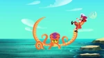 Back in Tentacle Bay, Captain Hook refuses to let the octopus stand in his way but the result is the same, even with the assistance of his bumbling crew. The octopus tosses Hook and his crew deep into the jungle. Jake and his crew soon return to Tentacle Bay with the diamond, but as Jake and the octopus are in the middle of their trade, Hook swoops in and manages to steal both treasures, but the captain and his crew are captured yet again by the octopus, who begins juggling the pirate crew. Seeing their chance to save the Glam-Shell, Izzy uses her pixie dust, granting the octopus flight. The octopus drops Hook and his crew back into the sea to flee, finally allowing Jake and his crew to trade for the Glam-Shell. Jake and his soon return the Golden Glam-Shell to Queen Coralie, allowing the Fin and Frolic dance party to begin.