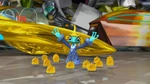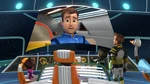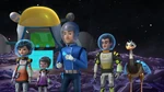 The ships leave the asteroid mover, and inside the Photon Flyer, Miles and M.E.R.C. see Gadfly escaping. Miles informs everyone else of such, and Phoebe tells him to be careful. Gadfly tries to escape, but his boot-clamp is delaying his progress. Eventually, it causes Gadfly to temporarily lose his blast-jet function. Miles saves him by attaching his Blastbuckle tether to Gadfly just as Gadfly falls off. Gadfly questions why Miles is saving him. As Miles retrieves the blast-jet, it gets activated, and Miles is hanging off one of its straps while the other is stuck on a ledge. M.E.R.C. catches the tether attached to Gadfly, and lets Gadfly down slowly. Gadfly catches the top strap of the blast-jet just as it falls off the ledge. The SpaceGuard Cruiser and the Star Jetter arrive, and the Callistos and Joe question where Miles is. Gadfly pulls the blast-jet and Miles up, and Miles tells everyone that Gadfly saved him. Joe states that he has heard everything. Gadfly questions if Joe does not know the cosmic explorer rule he learned, which is to be nice to everyone in space. Joe tells Gadfly that he can tell him all about it in jail. Joe and Gadfly then head to the SpaceGuard cruiser, which leaves the moon.