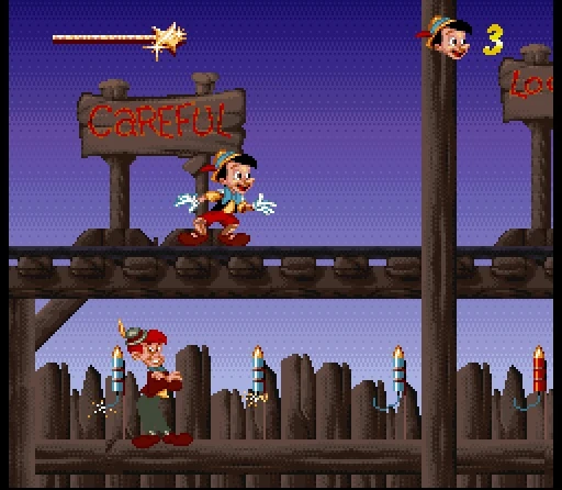 Pinocchio is probably the easiest SuperNintendo games I have, but it's still fun. First off, just like The Lion King, it has all the music from the movie. I also thought it was cool how we got to play as Jiminy Cricket for one small level. One of my favorite levels is the "I've got no strings" level, where you have to do what the other puppets do. I also like how, there's only one boss, the coachman. And here, we actually get to see him get him get his comeuppance. However, the hardest level for me is the last one, where you try to escape from Monstro. I try everything I can, but. I keep getting sucked back into his mouth. If anyone knows how to beat him, just let me know. But, overall, this is a really fun game. Definitely check it out. I think you might like it.