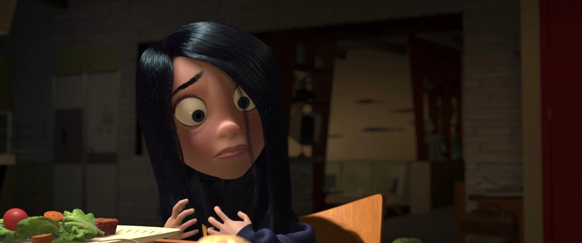 Back home, she becomes a saddened and agitated wreck. She eventually finds out that Bob had contacted Dicker to find Tony and wipe his memory of Violet's identity as a Super, incidentally wiping the date he had planned with Violet. Furious, Violet openly denounces her life as a Super and attempts to destroy her suit in the kitchen sink's garbage disposal, which proves futile. Trying to fix the situation, Bob brings his children to a restaurant called The Happy Platter, where Tony works part-time at. Violet is unaware of this fact and is astonished that Tony is serving them, spraying the water she was drinking out of her nose.