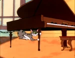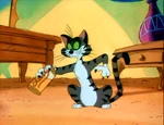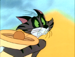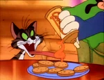 - ↑ Of Waffles, Pistol melodramatically yells, "Save that poor kitty, P.J.! Don't let him die all alone in that tree!"