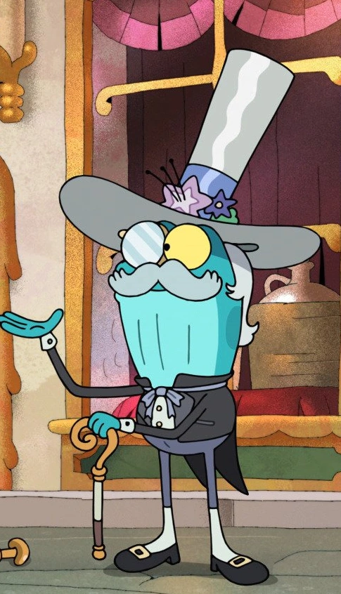 Wigbert is a cyan blue frog with a lighter underbelly with slick back white hair. He has one yellow eye and another one that is actually a ball used for bug-polo which he convers with a monocle. He also wears upper-class styled clothing which consists of a brown shirt and white pants fastened with a black belt, along with black boots with golden buckles.